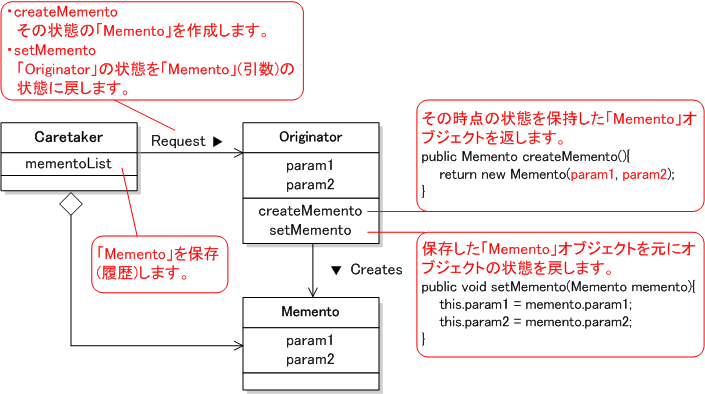 このパターンは, あるオブジェクトの任意の時点の状態を覚えておき (保存), 後でその状態にオブジェクトを戻すための工夫を提供するパターン. (カプセル化を破壊せずに, 状態を元に戻せる)