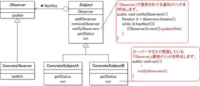 このパターンは, 観察者となるオブジェクトが, 観察対象となるオブジェクトからの状態変化の通知を受けそれに体する処理を行うパターン.
