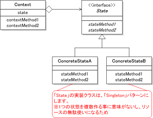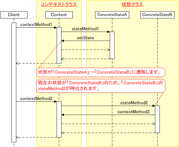 現在の状態 ( [ConcreteStataA] か [ConcreteStateB] ) を保持する. 利用者へのインタフェースを定義する. 状態を変更するメソッドを定義する. (状態の変更は, [ConcreteState] が次々の状態として相応しいものを判断し, この状態変更メソッドを呼び出すことによって行う.)