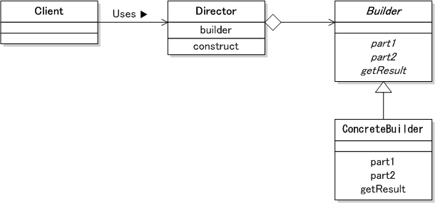 [ConcreteBuilder] の実態に関係なく, [Builder] に提供されているインタフェースのみを使用し, 建築する. その構築過程は, [Client] から隠蔽する.