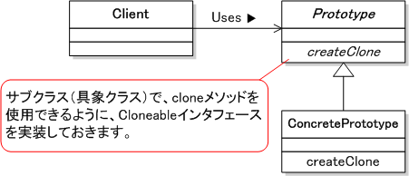 オブジェクト複製メソッドのインタフェースを定義する. 上記メソッドを [ConcretePrototype] で実装する際に [clone()] メソッドを使用する場合は, [Prototype] に [Cloneable] インタフェースを実装させる.