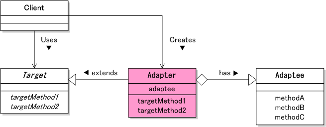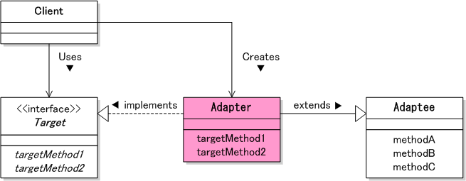 [Adaptee] のメソッドのインタフェースを吸収し, [Target] から利用できるインタフェースに変換する. 実装方法としては, 以下の 2 通りある.