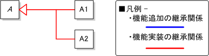 抽象クラス A と, A を継承し抽象メソッドを実装したクラス A1, A2 の下図の関係があるとする.