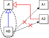 この場合, クラス AB からは, クラス A1, A2 の実装メソッドをそのまま使用することができない. (A を継承しているので, 抽象メソッドのインタフェースは存在するが, クラス AB の実装がない)