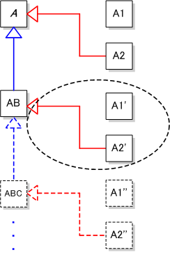 上図状態のクラス関係に, 抽象クラス A への機能追加のため, クラス AB を追加したとする. (下図参照)