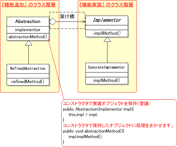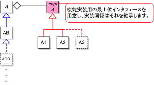 このように機能実装関係のクラスを, クラス A に保持させる (架け橋を作る) ことにより, 機能追加しても実装関係のクラス階層には影響せず, また逆に, 実装クラスを追加しても機能のクラス階層に影響しない構造にすることができた.