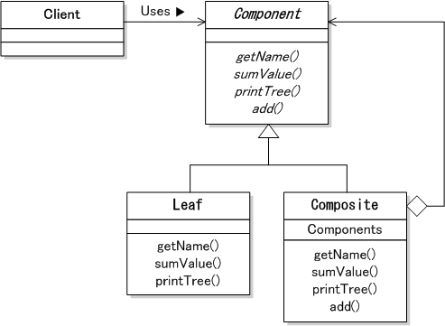 つまり, [Composite] パターンは階層構造で表現されるオブジェクトの取り扱いを容易にするパターンである.