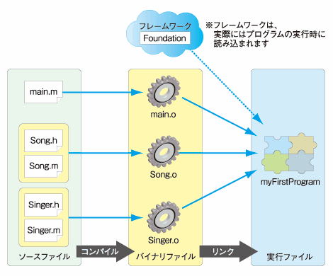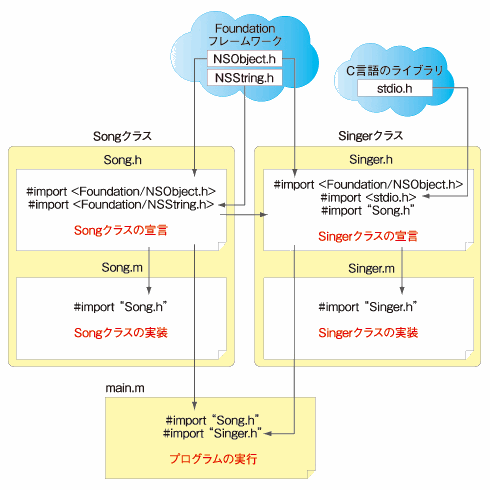 上記の図では, Singer.h で Song.h の読み込みが指示され, さらに main.m では Song.h と Singer.h の両方の読み込みが指示されているので, main.m において Song.h が 2 度読み込まれているように見えるが, #import では同一のヘッダファイルが 2 重に読み込まれることはない.