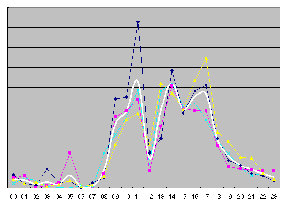 ・次のグラフは、平日の時間あたりページアクセス数をプロットしている。