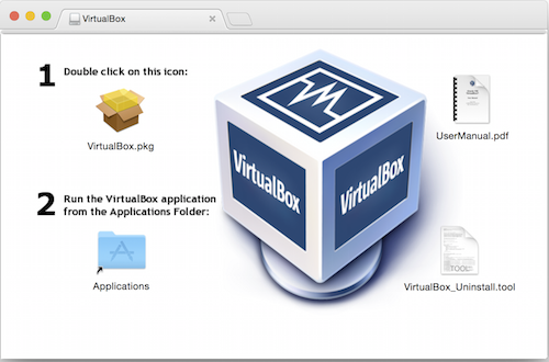 ダウンロードした VirtualBox-5.0.0-101573-OSX.dmg をダブルクリックして、以下のようなウィンドウが表示される。ウィンドウ中の VirtualBox.pkg のアイコンをダブルクリックする。
