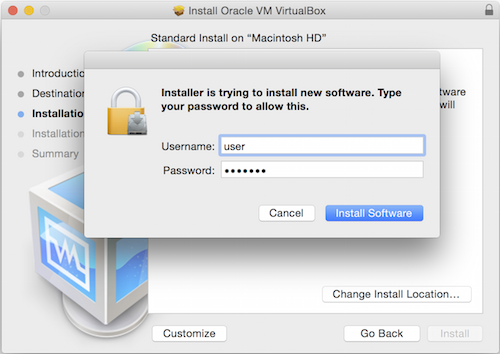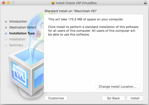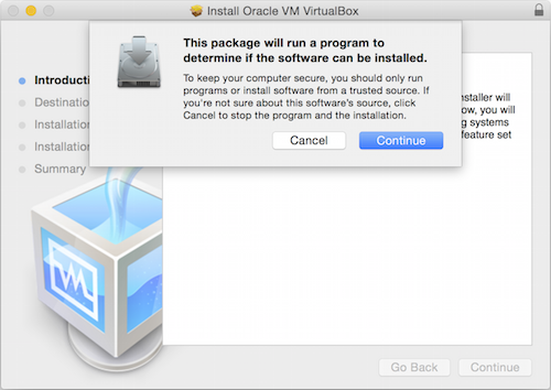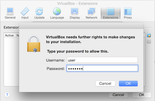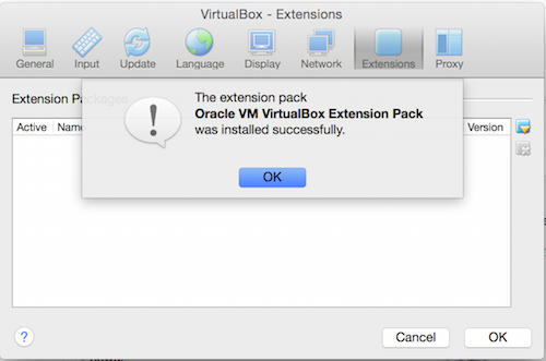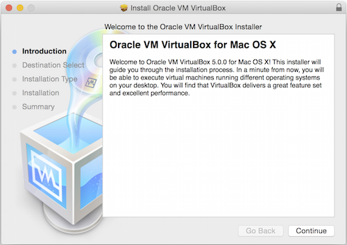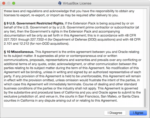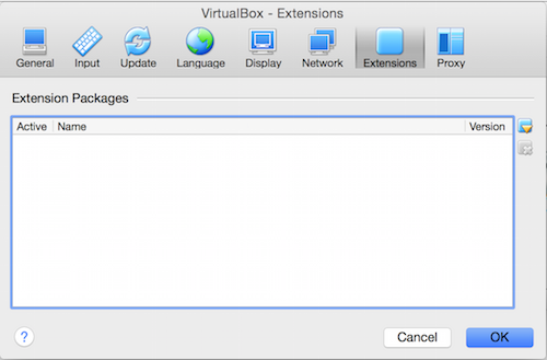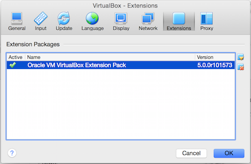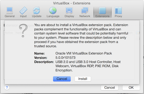 VirtualBox をインストールするさいに、VirtualBox 本体のほかに拡張パッケージも合わせてインストールしておく便利である。VirtualBox 本体とその拡張パッケージは、Oracle Virtualbox Download ページでダウンロードできる。VirtualBox 本体のファイル名は VirtualBox-5.0.0-101573-OSX.dmg のようになって、その拡張パッケージのファイル名は Oracle_VM_VirtualBox_Extension_Pack-5.0.0-101573.vbox のようになっている。