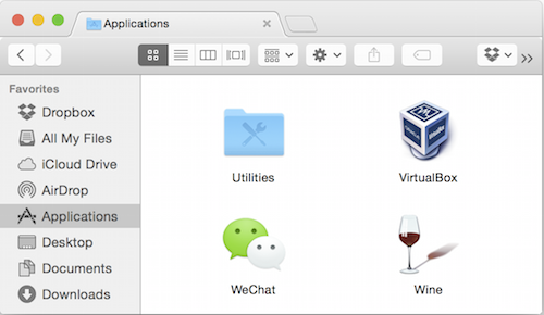 インストールされた VirtualBox は、Mac の Applications から起動できる。