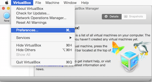 VirtualBox を起動してメニューから Preferences (環境設定)を選ぶ。