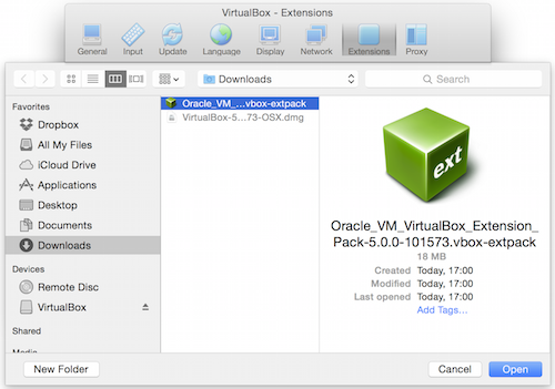 ダウンロードした Oracle_VM_VirtualBox_Extension_Pack-5.0.0-101573.vbox を指定して、Open をクリックする。