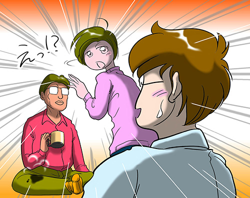 八木くんの手にしたカップから、膝の上にコーヒーがこぼれます。