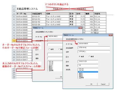 「各データのオーダーNoのセルをダブルクリックしたら、そのオーダーNoで修正フォームを開く、
