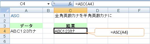 下図の例 =ASC(A4) は