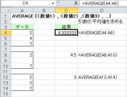 - 12行目の例は =AVERAGE(A12:A14) では平均の 3 が求まります(ゼロはデータとして扱われます)