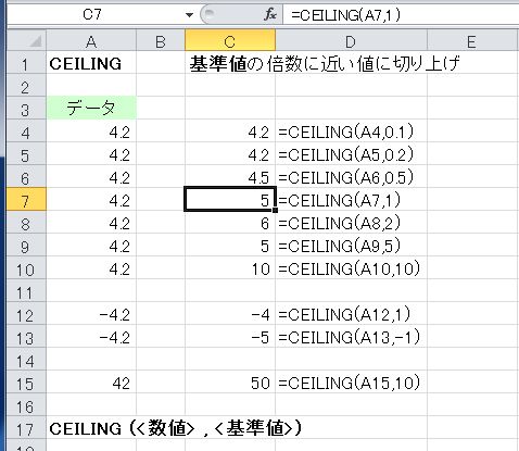下の7行目の例 =CEILING(A7,1) は 4.2 を1 の倍数の 5 に切り上げる例が表示されています