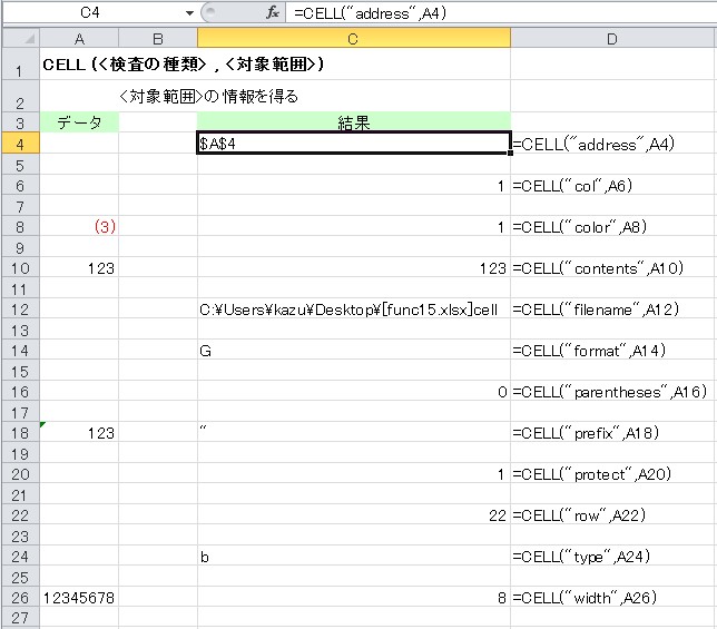 - 4行目の例 =CELL("address",A4) は セルA4のアドレスで $A$4 になります