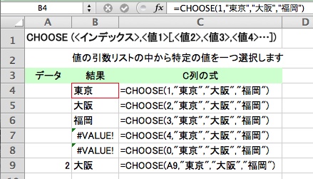 =CHOOSE(0,"東京","大阪","福岡") の結果は 引数リストの 0番目のデータが無いので エラー #VALUE! になります