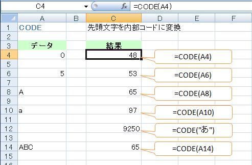 CODE 関数・もっと詳しく → ExcelPedia:CODE (PDF書類が別窓で開きます)