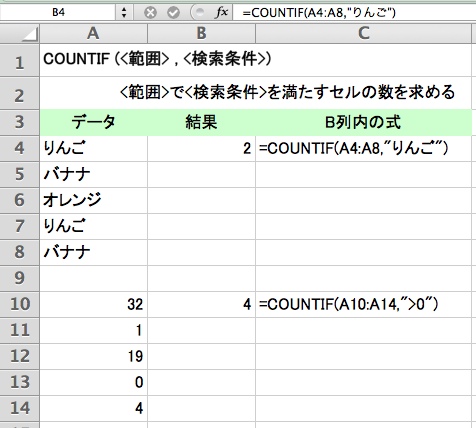 4行目の例 =COUNTIF(A4:A8,"りんご") は