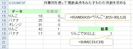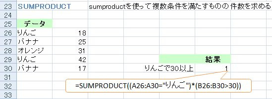 =SUMPRODUCT((A26:A30="りんご")*(B26:B30>30))