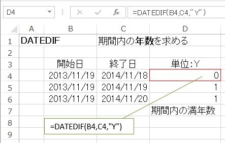 セルD4 に =DATEDIF(B4,C4,"Y") と入力すると、セルD4 には 2013/11/19 から 2014/11/18 までの年数 0 が求まります
