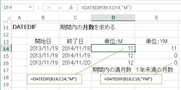 セルD14 に =DATEDIF(B14,C14,"M") と入力すると、セルD14には