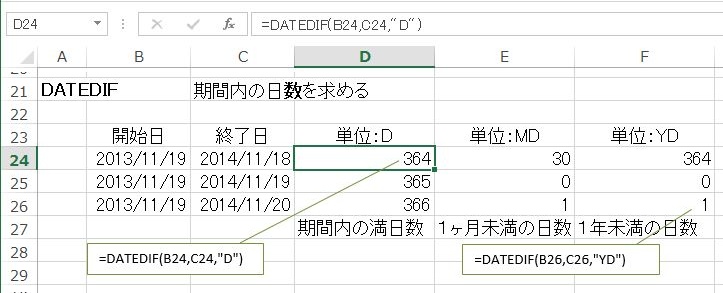 セルF24 に =DATEDIF(B24,C24,"YD") と入力すると、セル F24 には 2013/11/19 から2014/11/18 までの1年未満の日数 364 が求まります