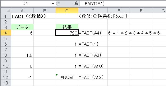 - 4行目の例は =FACT(A4) セルA4が 6 なので 6! = 1 * 2 * 3 * 4 * 5 * 6 の計算で 720 が求まります