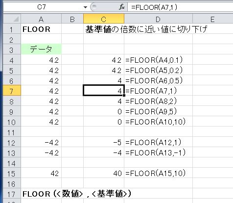 下の7行目の例 =FLOOR(A7,1) は 4.2 を1 の倍数の 4 に切り下げる例が表示されています