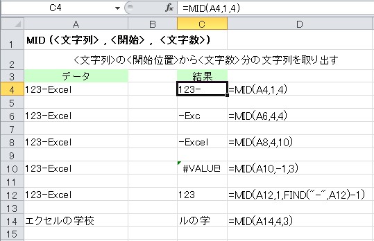 - 4行目の例 =MID(A4,1,4) は 123-Excel の先頭から4文字を取り出し 123- になります