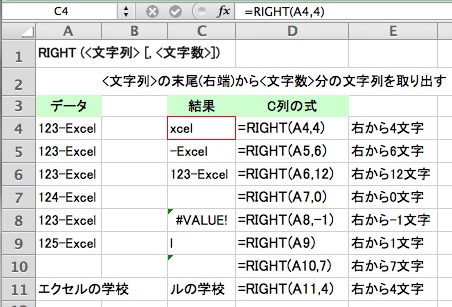 - 11行目の例 =RIGHT(A11,4) は エクセルの学校 の右端から4文字取り出し ルの学校 になります