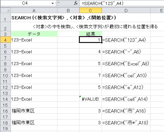 - 4行目の例 =SEARCH("123",A4) は 123-Excel の中で 123 を探し、結果は 1 (先頭)になります