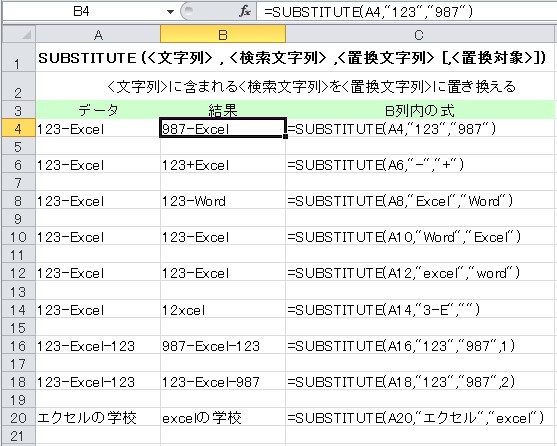 4行目の例 =SUBSTITUTE(A4,"123","987") は 123-Excel の中で 123 を探し 987 に置き換え、