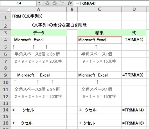 4行目の例 =TRIM(A4) は
