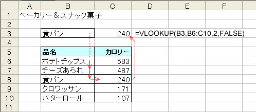 VLOOKUP は赤い矢印の経路で ポテトチップス → チーズあられ → 食パン と探し