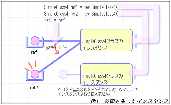 このプログラムでは、SimpleClass4クラスのインスタンスを2つ作っているのですが、ref2変数に入っていた「後に作ったインスタンス」の参照を、「最初に作ったインスタンス」の参照で上書きしてしまうため、「後に作ったインスタンス」の参照がなくなってしまいます。