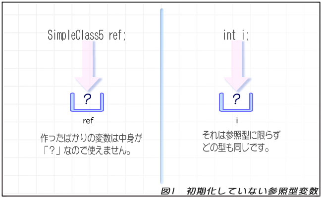 // SimpleClass5クラスの参照型変数を作ります。 SimpleClass5 ref; // この状態で使うとコンパイルエラーになります。 // ref変数が初期化されていないためです。 ref.data = 100; // コンパイルエラー: // NoRefRunner.java:24: 変数 ref は初期化されていない可能性があります。