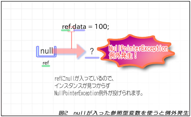 この状態で「参照型変数.フィールド」のようにインスタンスを操作しようとすると、インスタンスが存在しないので「NullPointerException」という例外が投げられます。