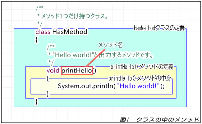 メソッドには、メソッドの中身の書き方の他、引数や戻り値、例外の指定等、知っておかないといけないことが多々ありますが、これらは「オブジェクト指向」とは関係がないため割愛させていただきます。