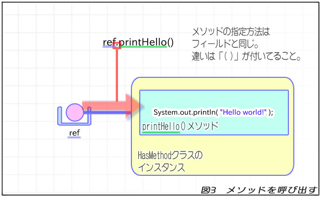 メソッドの呼び出し方は、フィールドと同じように「参照型変数.メソッド名()」と「.」を使って指定します。