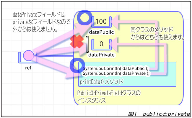 // dataPrivateフィールドに数値を入れます。 ref.dataPrivate = 100; // コンパイルエラー: // PublicOrPrivateFieldRunner.java:40: // dataPrivate は PublicOrPrivateField で private アクセスされます。