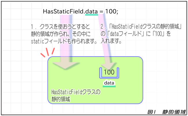 静的領域は、初めは存在していないのですが、最初にクラスを使う時――たとえばstaticフィールドを使おうとした時や、インスタンスを作ろうとしたとき――に、自動的に作られます。