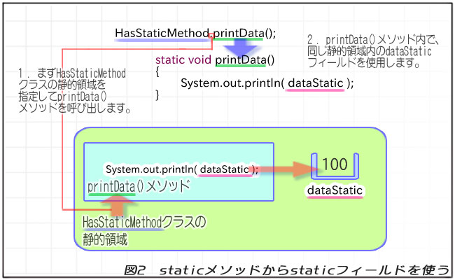 静的領域の中にstaticフィールドとstaticメソッドが一緒に入っているので、たとえばこの例でdataStaticフィールドがprivateなフィールドだとしても、printData()メソッドはdataStaticフィールドを使うことができます。