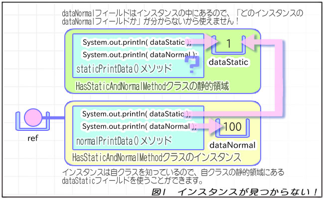 なんてしても、静的領域にあるstaticPrintData()メソッドから見て、dataNormalフィールドが「どのインスタンスのdataNormalフィールドか」ということが指定されていないわけですから、dataNormalフィールドを使えるわけがないのです。