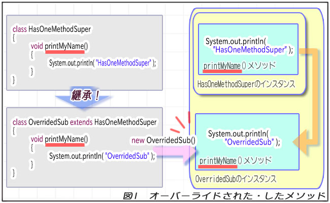 両方にある場合、サブクラスのprintMyName()メソッドが「オーバーライドしている」ことになるので、このサブクラスのprintMyName()メソッドが呼び出されます。
