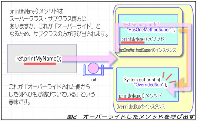 「ひもが付く」とどうなるかというと、オーバーライドされたメソッドを呼び出そうとすることで、自動的にオーバーライドしたメソッドが呼び出されます。